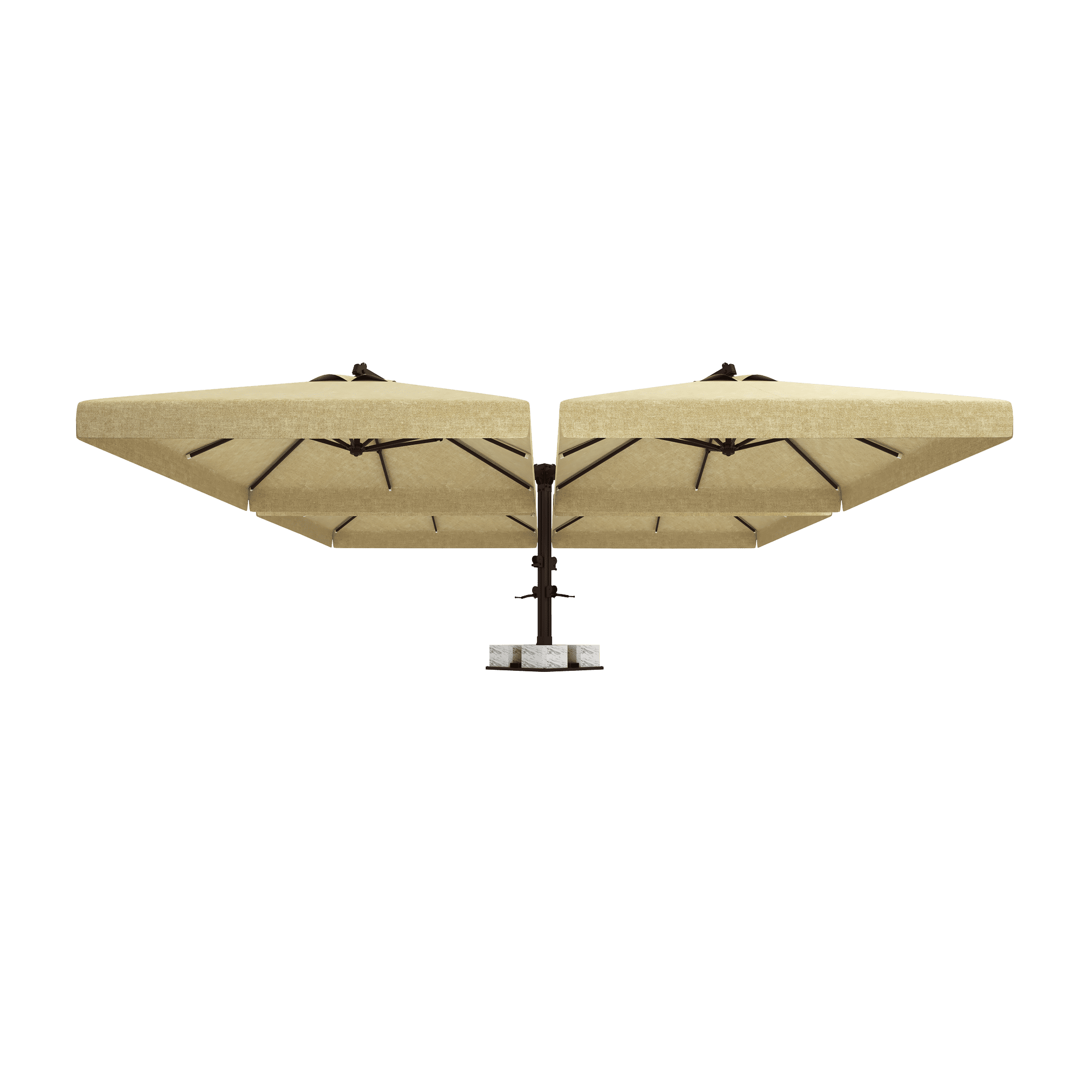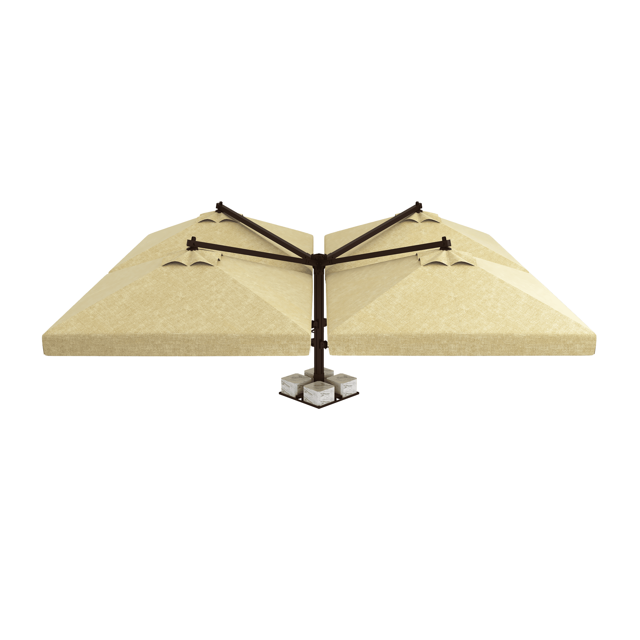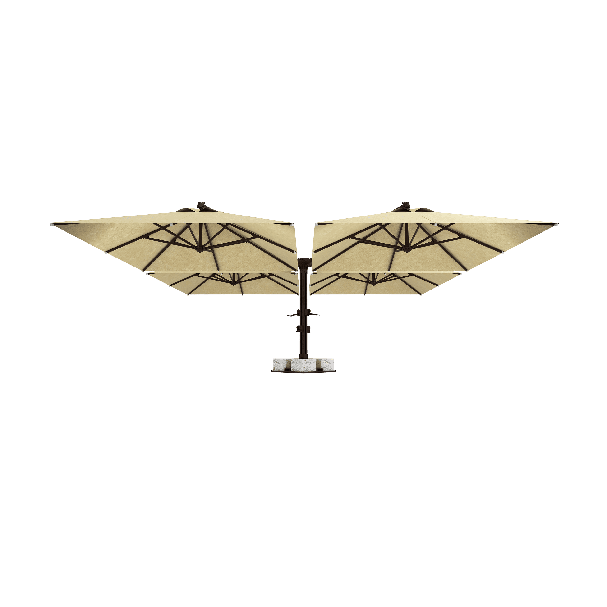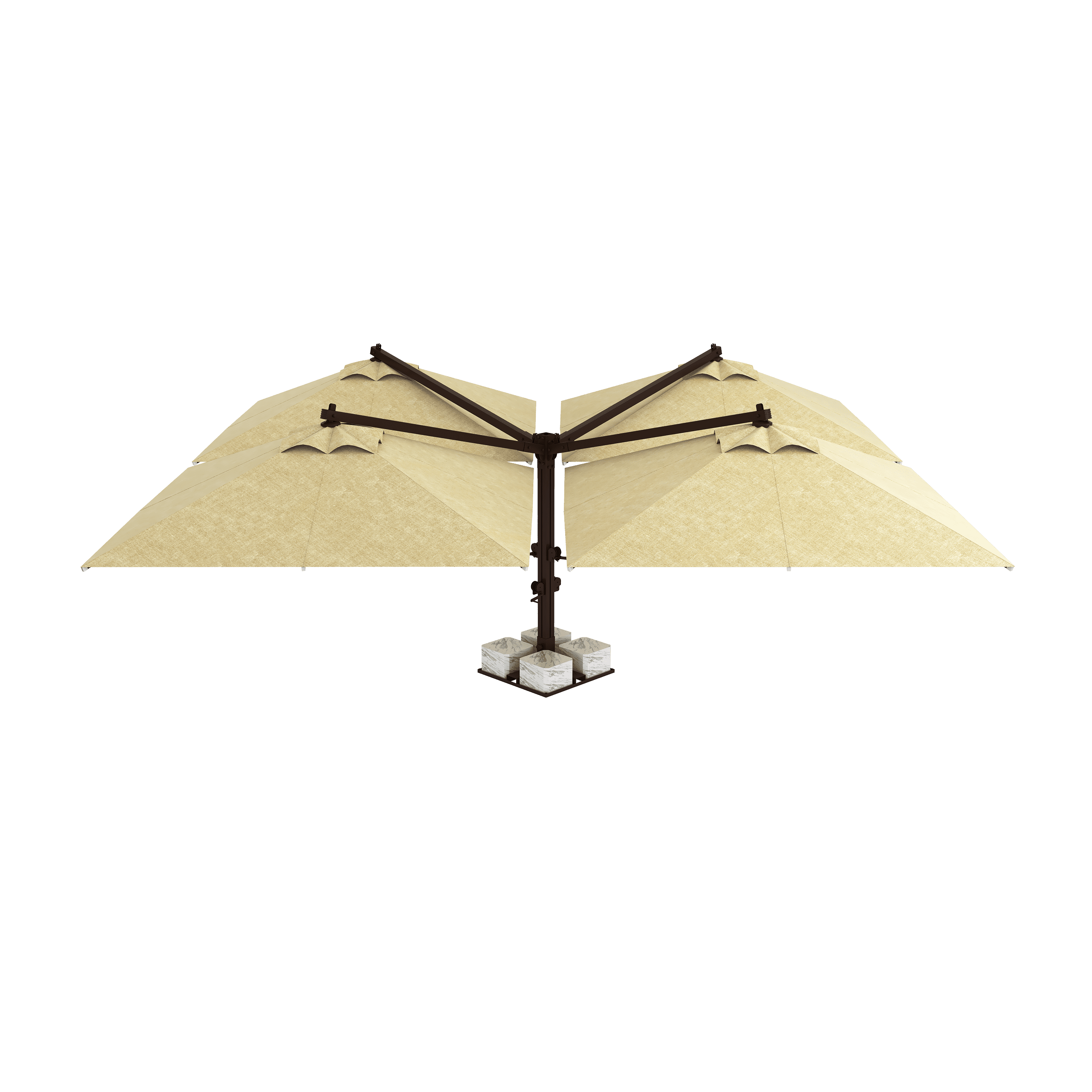 Normal şartlarda 4 farklı şemsiyenin yaratacağı ayak ve direk kalabalığını tamamen ortadan kaldırır. Tek bir merkezi direk sayesinde altında kalan tüm masalar ve sandalyeler kesintisiz bir yerleşim alanına sahip olur. Alan verimliliği arayan işletmeler için kusursuzdur.