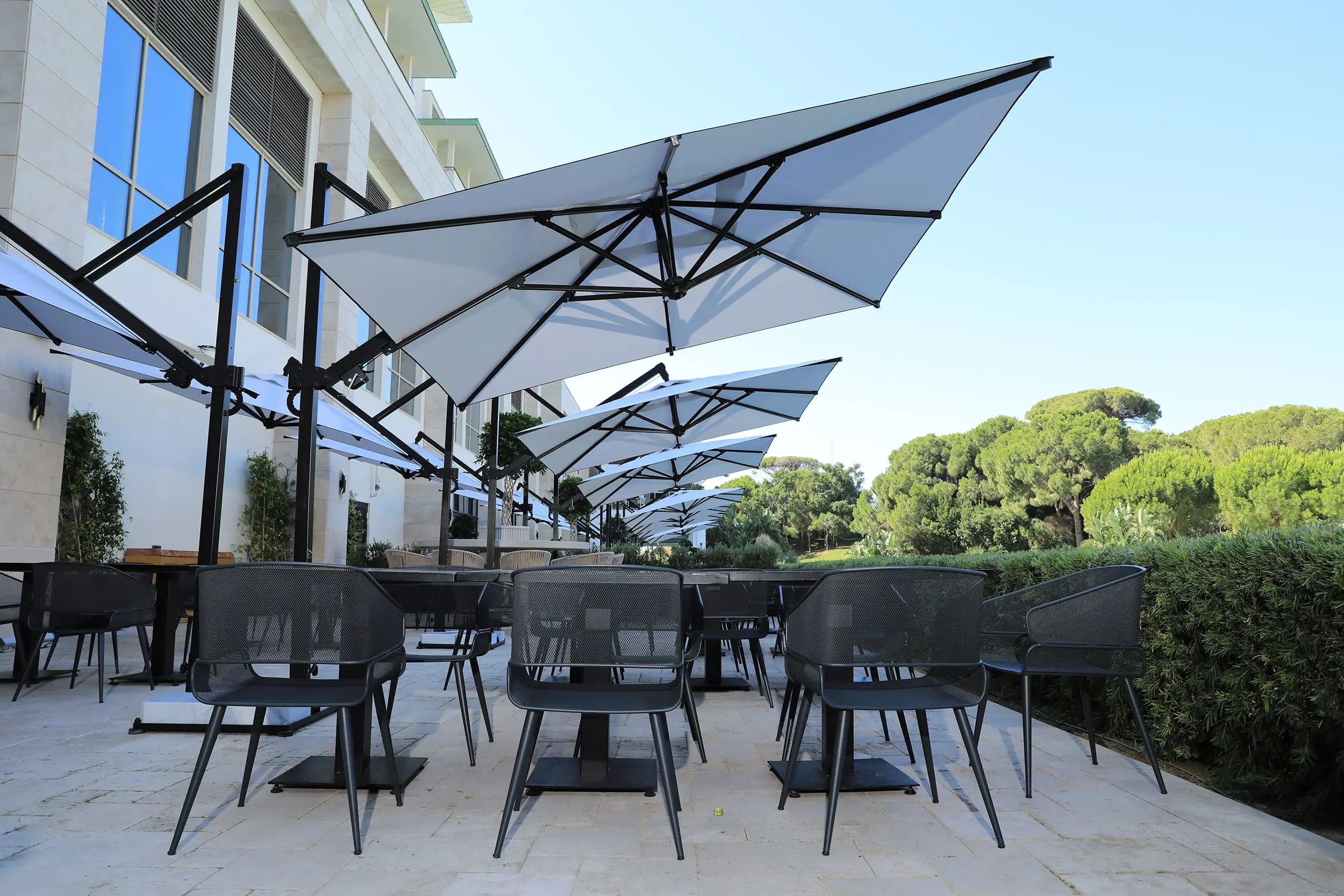 Tek direğe bağlı olmalarına rağmen her iki şemsiye de kendi başına açılıp kapanabilir. Daha da önemlisi, gün içinde yer değiştiren güneşe karşı şemsiyelere özel pozisyon ve eğim aldırarak misafirlerinize kesintisiz gölge sağlayabilirsiniz.